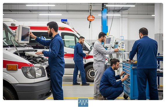 إدارة تشغيلية تشمل صيانة المركبات، تزويد المستهلكات الطبية، والمعايرة الدورية لمعدات الإسعاف عبر قسم الهندسة الطبية، لضمان جاهزية مستمرة واستجابة طبية فعّالة.